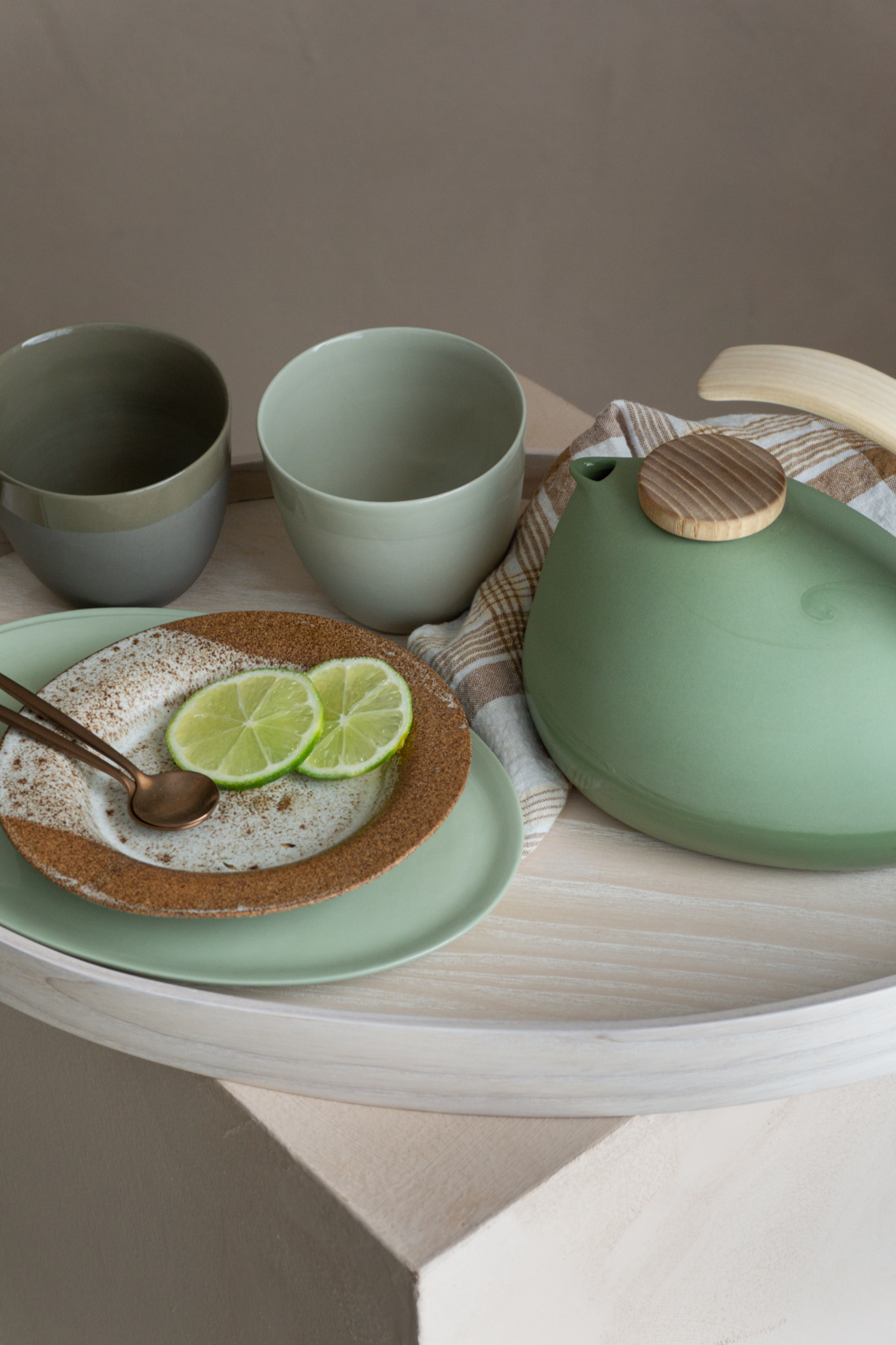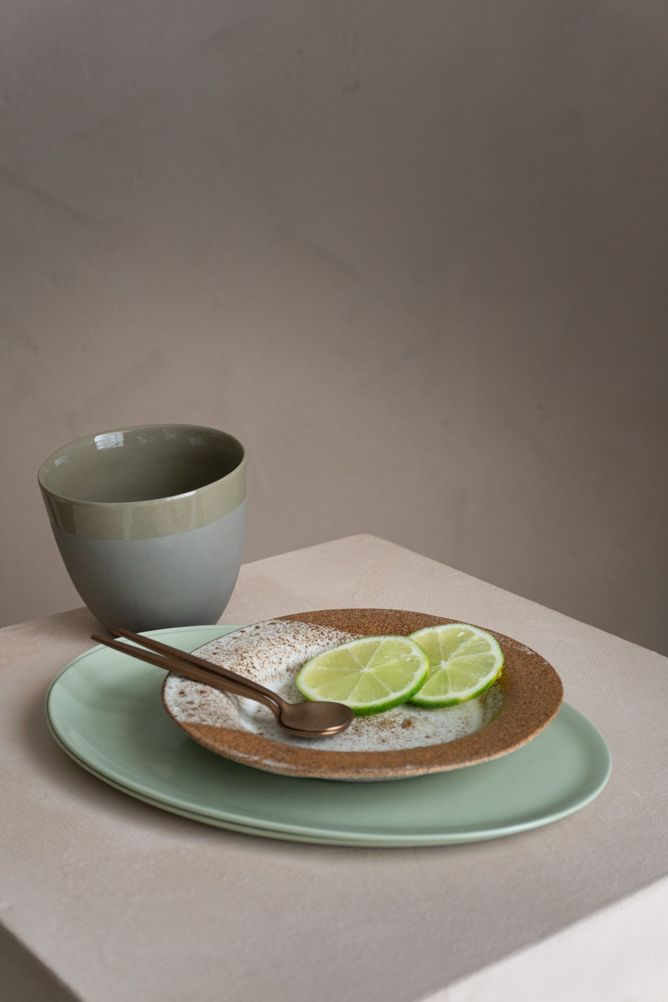 Et fint gavesett med to ulike tallerkner i porselen og steingods, og en kobber teskje som passer godt til.