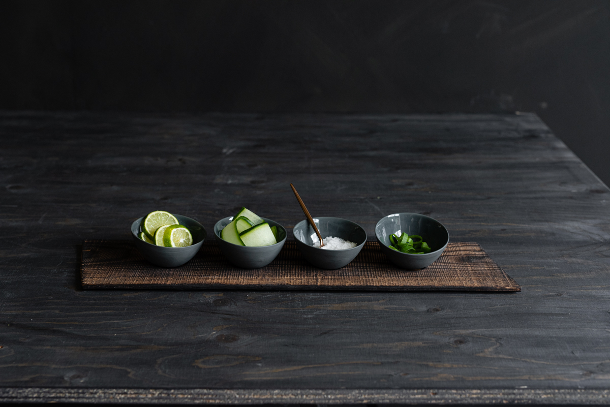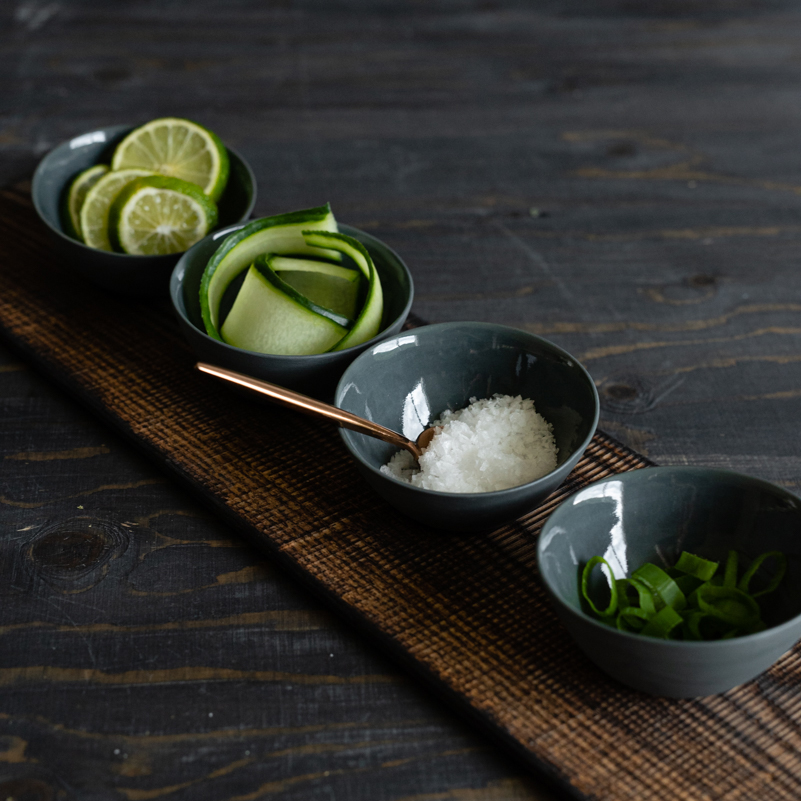 Sett med fire dippboller på trefjøl. Passer perfekt til små smaksretter.