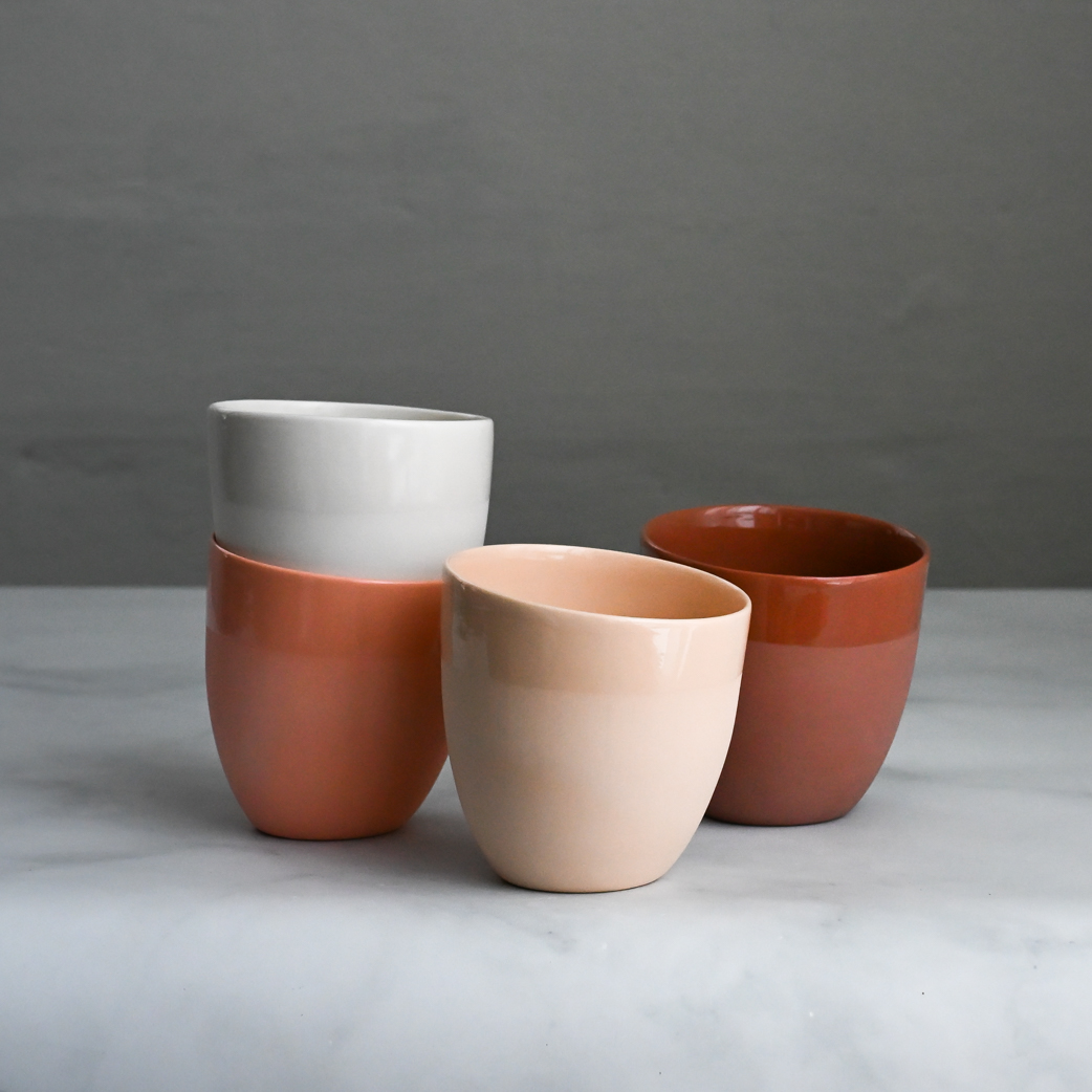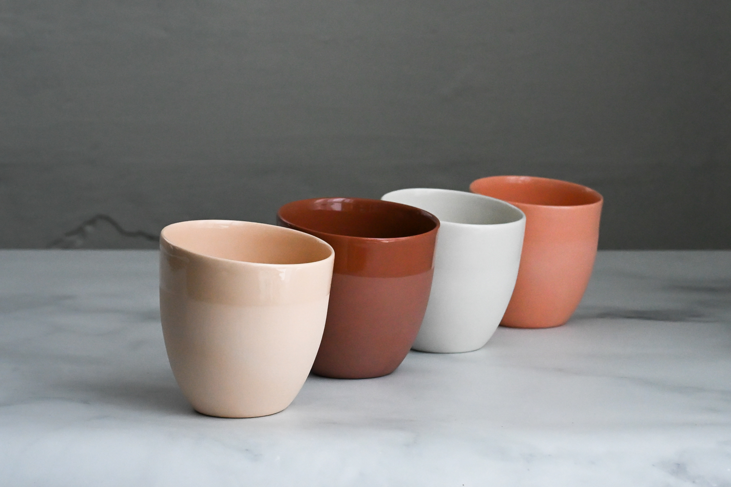 Koppene i KRUM-serien er laget i gjennomfarget porselen og glasert med transparent glasur inni og rundt kanten du drikker av. Det gir en behagelig, fløyelsmyk overflate å holde i. Den finnes i mange farger og tre størrelser; Tekopp, Kaffekopp og Espressokopp. Kan vaskes i oppvaskmaskin.