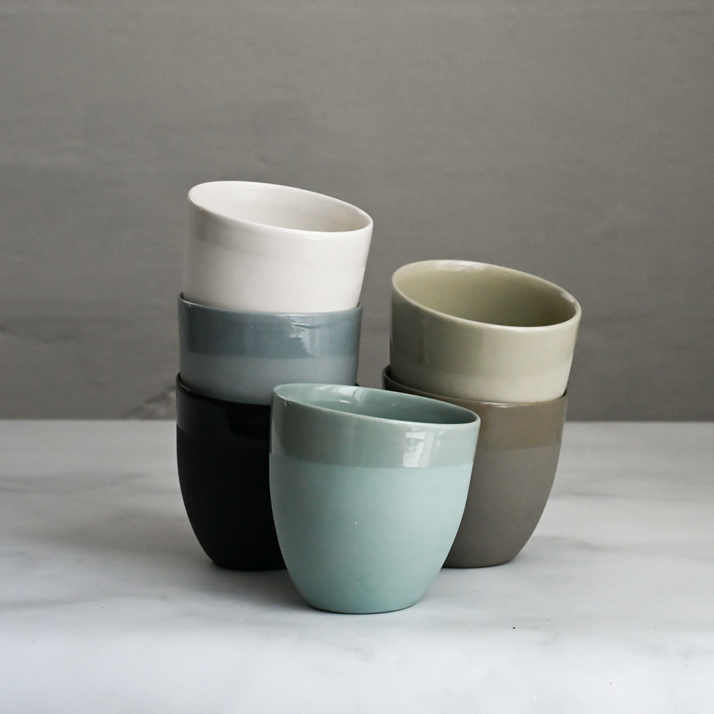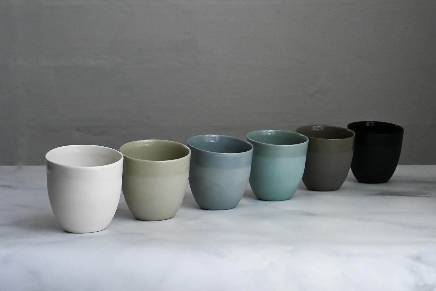 Koppene i KRUM-serien er laget i gjennomfarget porselen og glasert med transparent glasur inni og rundt kanten du drikker av. Det gir en behagelig, fløyelsmyk overflate å holde i. Den finnes i mange farger og tre størrelser; Tekopp, Kaffekopp og Espressokopp. Kan vaskes i oppvaskmaskin.