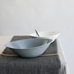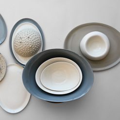 Vi støper produkter i gjennomfarget porselen. Det betyr at vi blander inn fargepigmenter i selve materialet i stedet for i glasuren utenpå. Denne metoden gjør at du vil kunne oppleve fargemarmoreringer, særlig i de mørke nyansene. Våre produkter formes av hender og håndteres manuelt gjennom alle produksjonsledd. Litt variasjon i farge, størrelse og fasong er derfor helt naturlig på vårt porselen. Det er det som gjør hvert produkt unikt. Lær mer om vår håndverksproduksjon her >