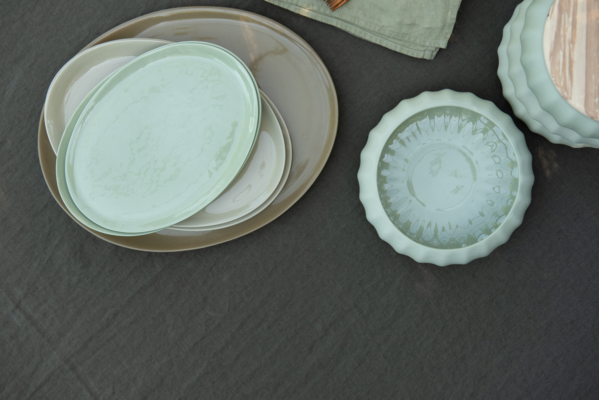 Håndlaget, oval tallerken i gjennomfarget porselen glasert med transparent glasur. Denne tallerkenen passer godt til frokost og lunsj. Den er også fin å bruke i kombinasjon med middagstallerkenen fra samme kolleksjon.
