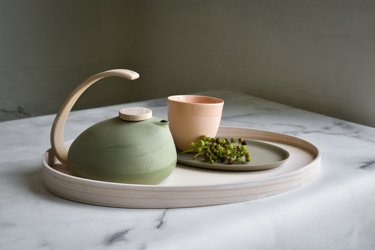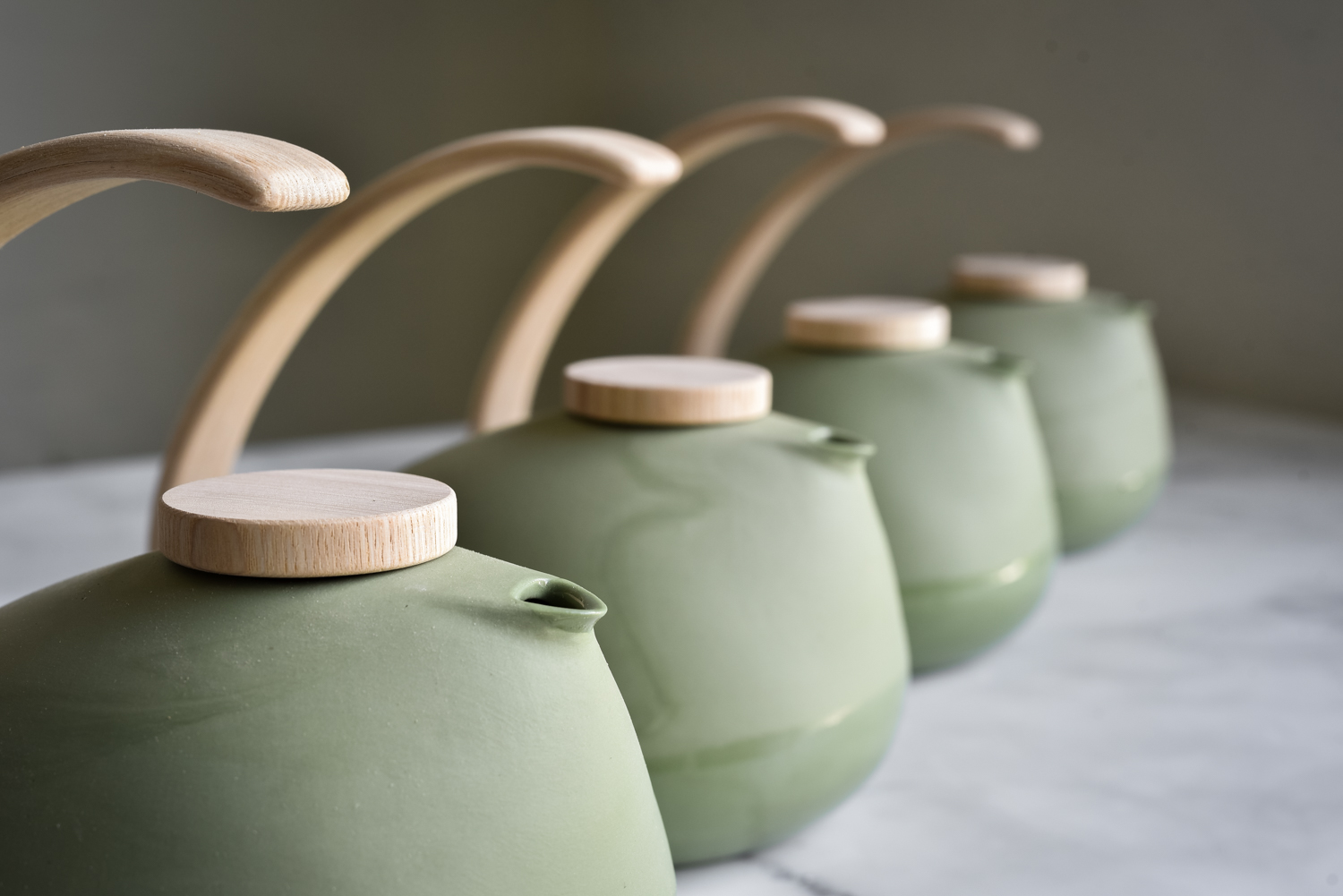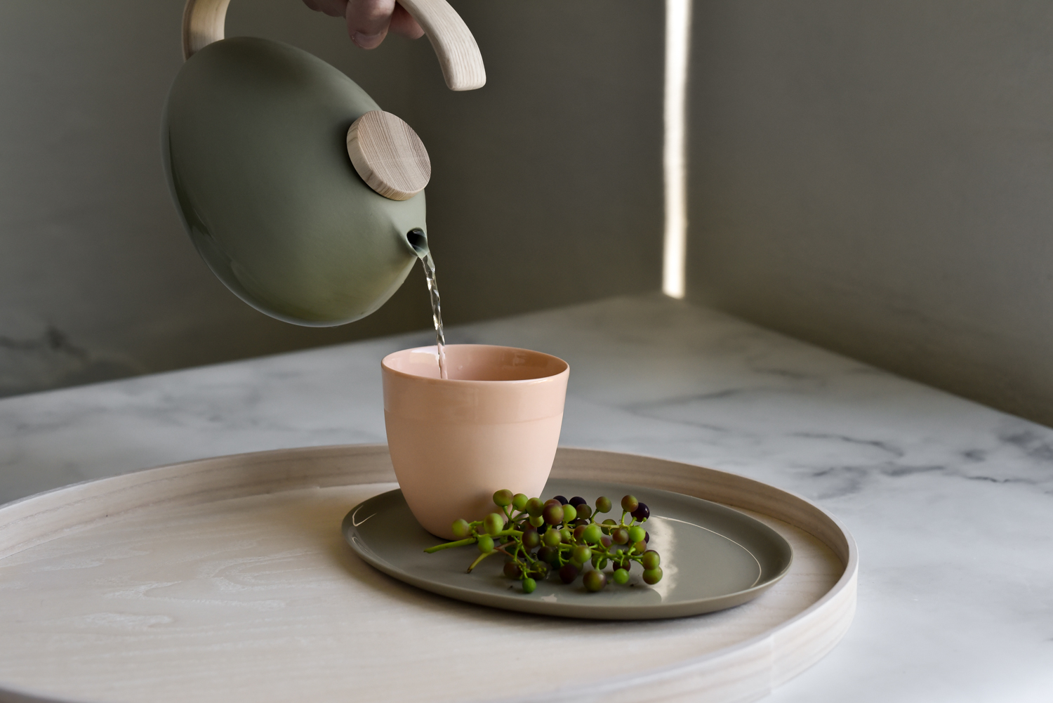 KRUM tekanne produseres i vårt verksted i gjennomfarget porselen, som betyr at vi blander fargepulver inn i selve materialet i stedet for å glasere produktet med farge utenpå. Det gir oss mulighet til vakre overganger mellom matt og blankt, og en delikat, taktil overflate som er god å holde i. På grunn av denne metoden vil du også oppleve noe marmorering i materialet der fargen ikke er helt utblandet i porselenet. Dette vil være mest fremtredende i de mørkeste fargene.