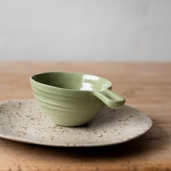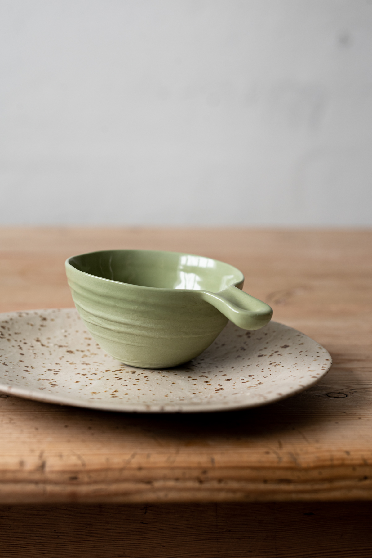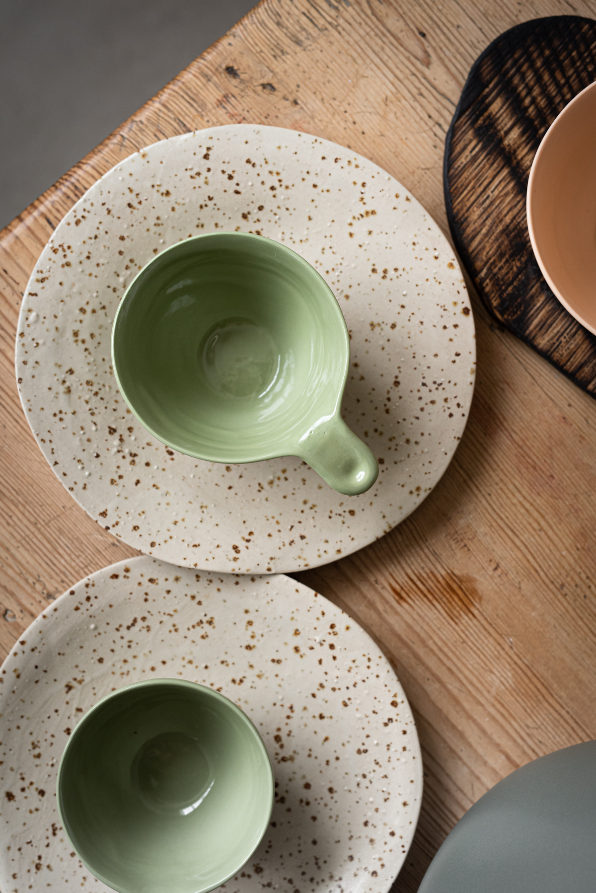 Koppen er håndlaget i gjennomfarget porselen og vil ha variasjoner i farge, størrelse og form. Hanken er god å holde i og praktisk når det serveres rykende varm bålkaffe. Koppen er brent på høy temperatur og kan vaskes i oppvaskmaskin