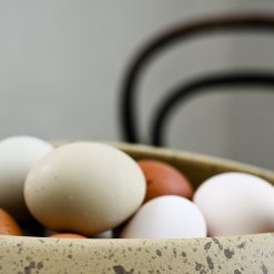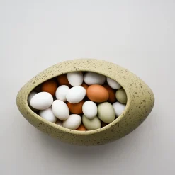 RAUS Egg håndlages i keramikk og glaseres med matt utenpå og blank glasur inni. Det tar 7 dager fra et nytt egg blir støpt til den har gått igjennom alle prosesser i produksjonen med vask av kanter og overflater, råbrann, glasering og glasurbrann. Egget som er spettet på utsiden er glasert med en spesiell glasur som reagerer med varmen i ovnen, slik at flekkene blir ulike for hvert enkelt produkt, og ingen egg er helt like hverandre - akkurat som ekte egg!