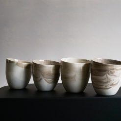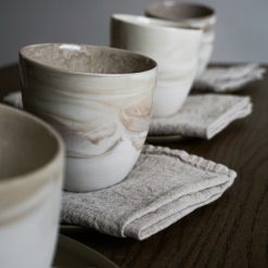 Denne spesielle koppen er laget med resirkulert ment®-porselen. Her har vi knust og siktet en miks av alle våre brune farger og marmoreringen i koppen oppstår naturlig når fargene blandes med hvitt når vi støper.  Hver enkelt kopp får sitt eget unike mønster, og det blir store variasjoner i farger og mønster, både utenpå og inni koppene. Ingen kopper er like, derfor er det ekstra fint med flere sammen.
