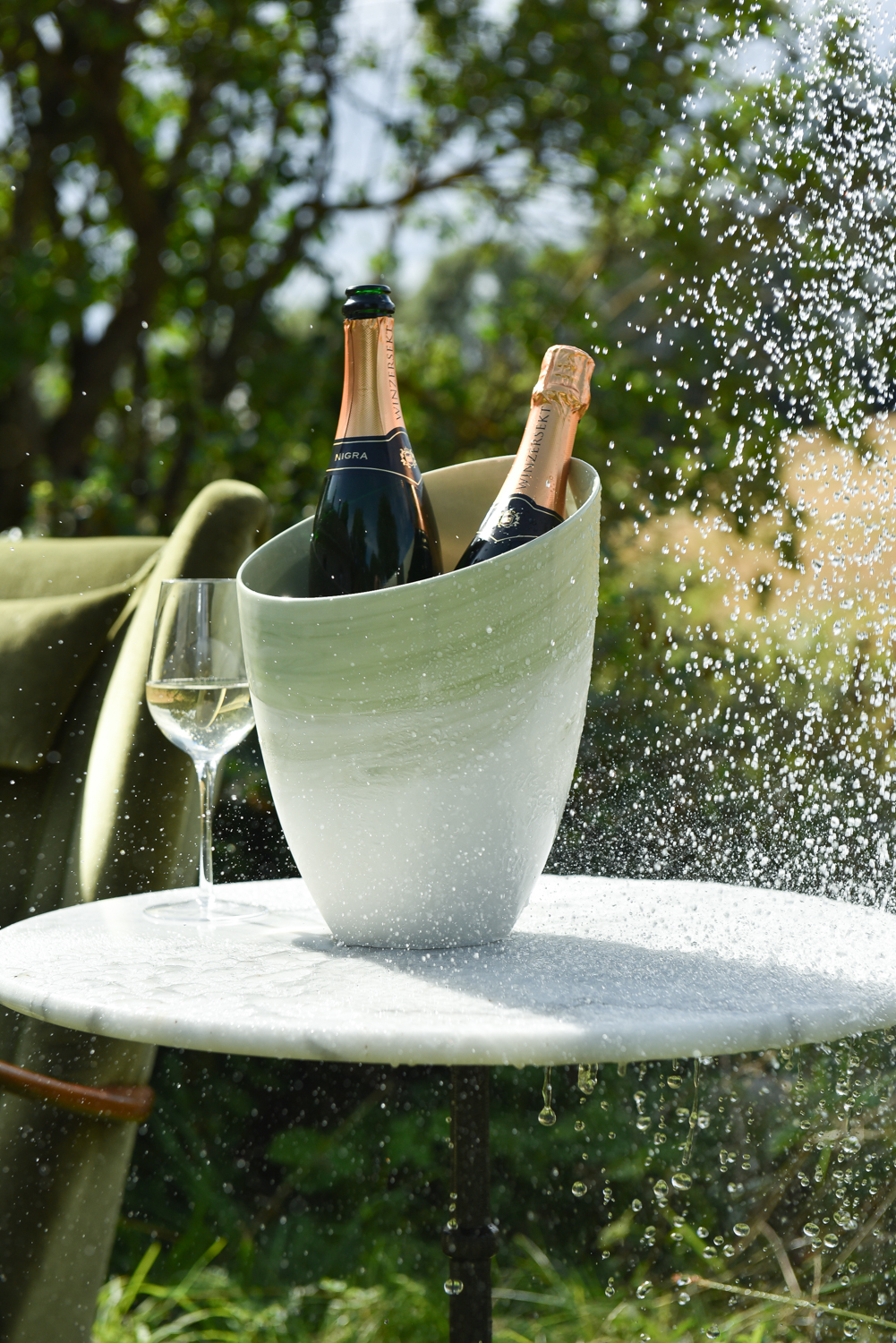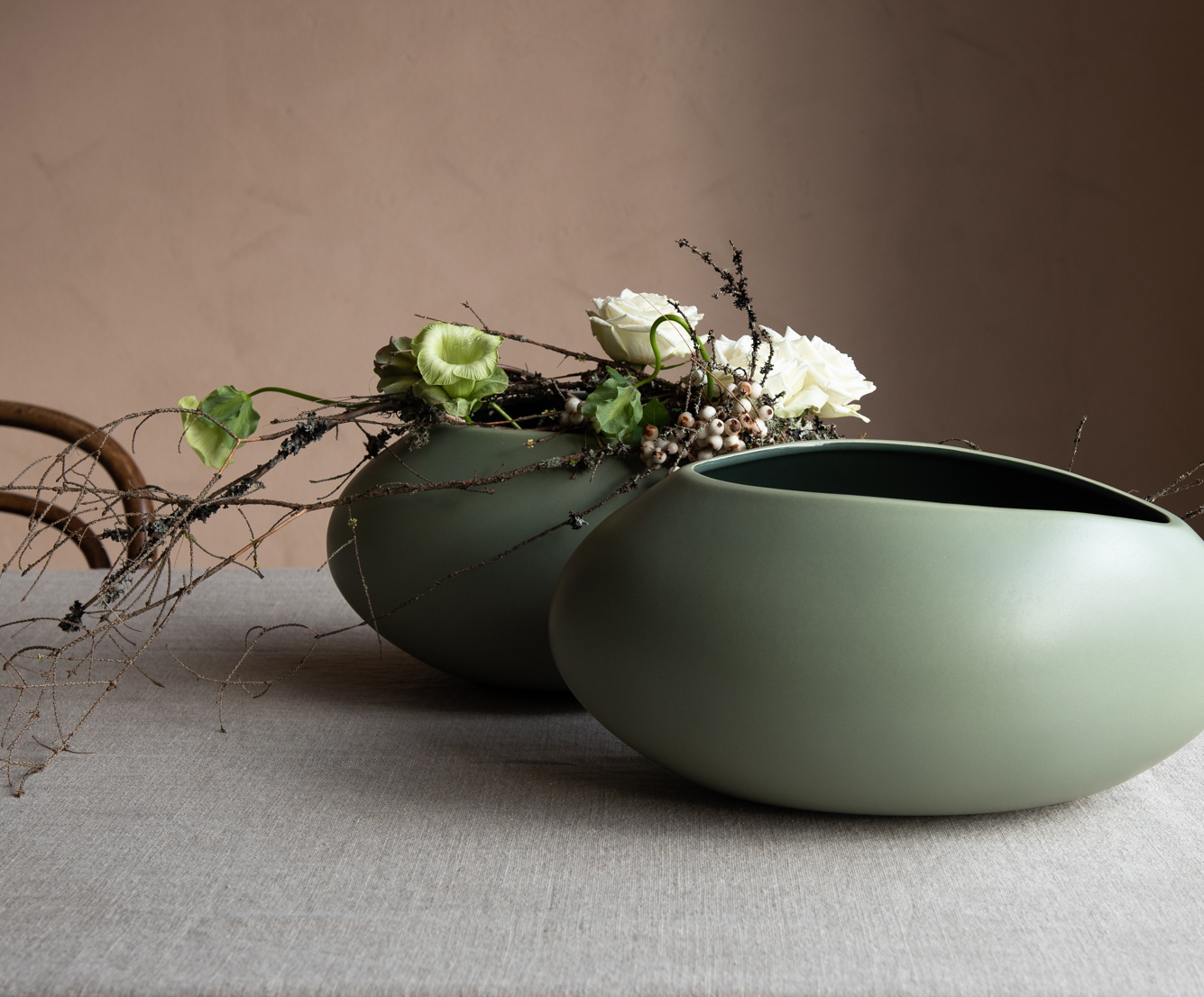 Laget med resirkulert ment®-porselen, der vi blander knuste rester av alle våre grønne nyanser med hvitt. Slik oppstår den naturlige marmoreringen – og ingen vaser blir like, verken utenpå eller inni. Bruk den som vase, vinkjøler eller lyslykt – en allsidig favoritt som alltid finner sin plass på bordet.