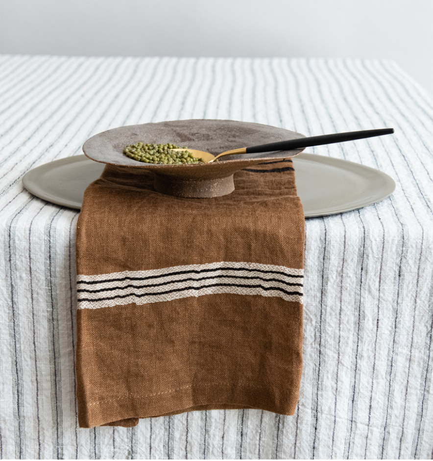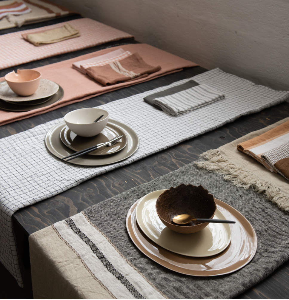 Start borddekkingen med en fin duk og linservietter. Husk;_ dette trenger ikke å være likt – kombiner gjerne farger og mønstre. Vi har et stort utvalg farger og mønstre som passer perfekt til våre produkter.