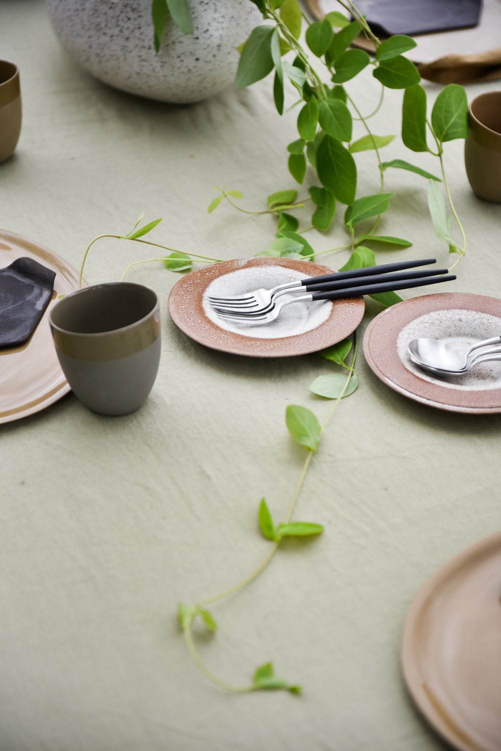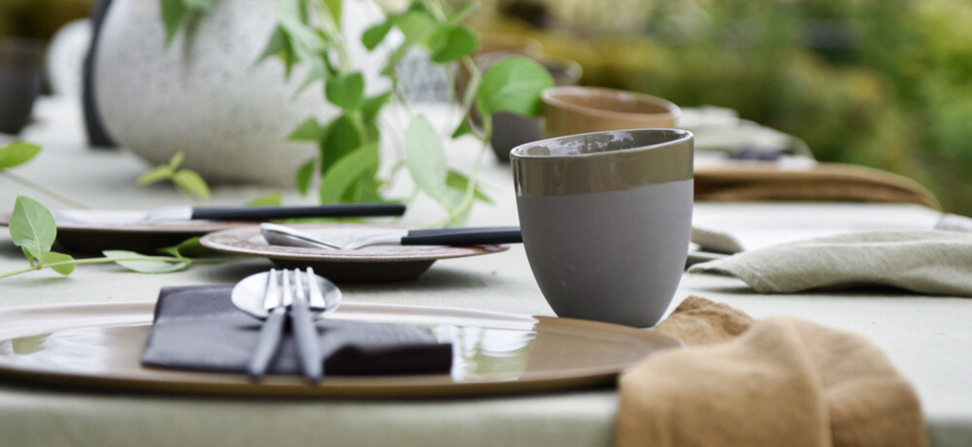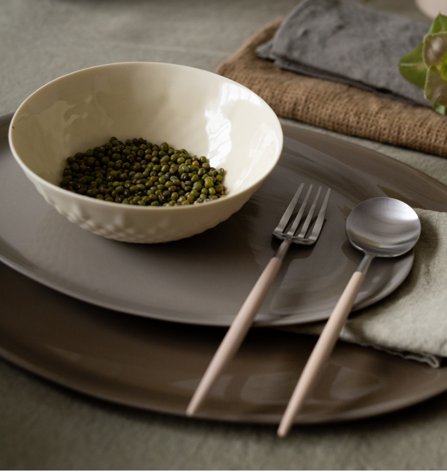 Lyse lintekstiler gir ro og eleganse. Fint med svake ruter og striper for at det ikke skal bli for stramt og høytidelig. Vi bruker neverkrull som serviettring for å få inn flere naturelementer. Bestikk fra serien Goa Ivory–stål passer perfekt til denne stemningen.