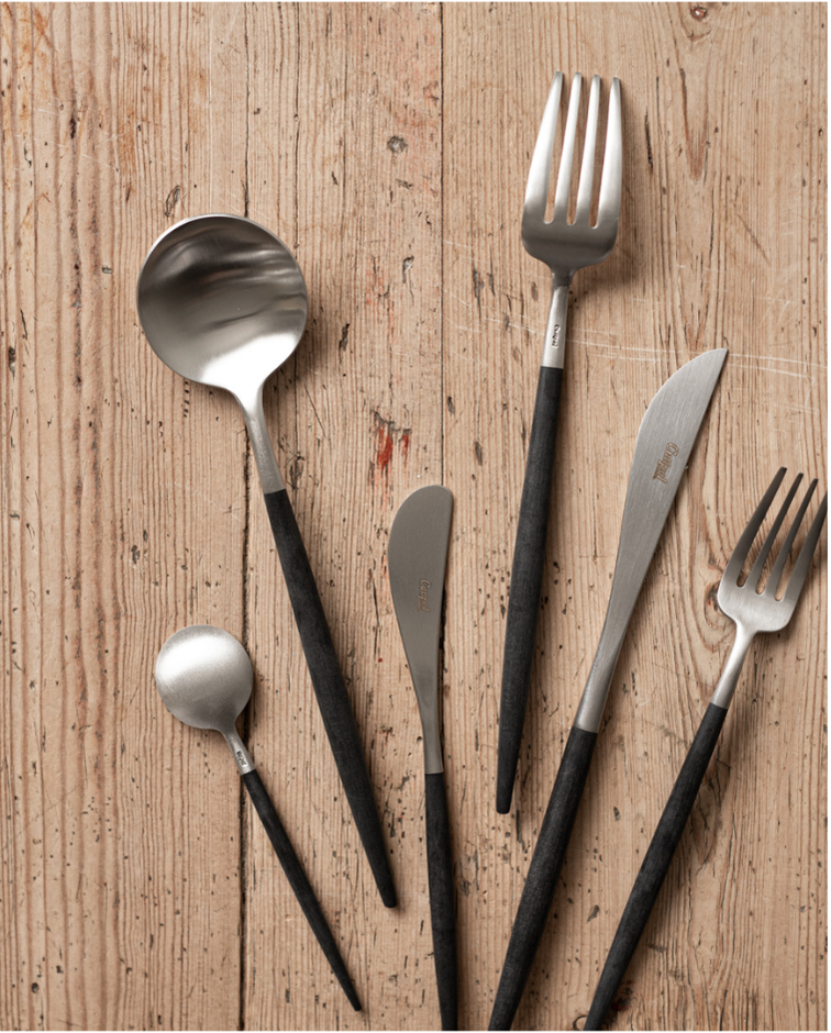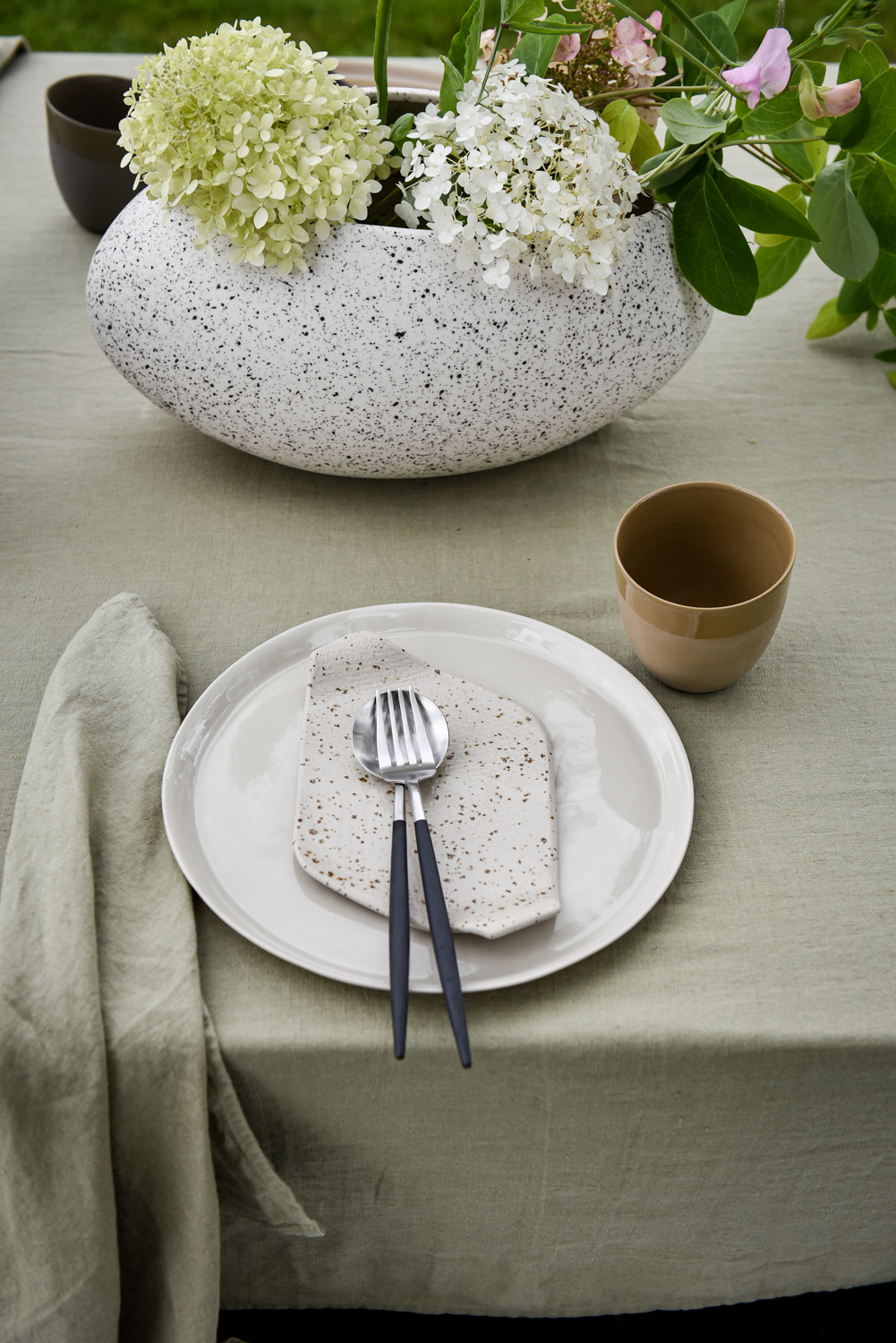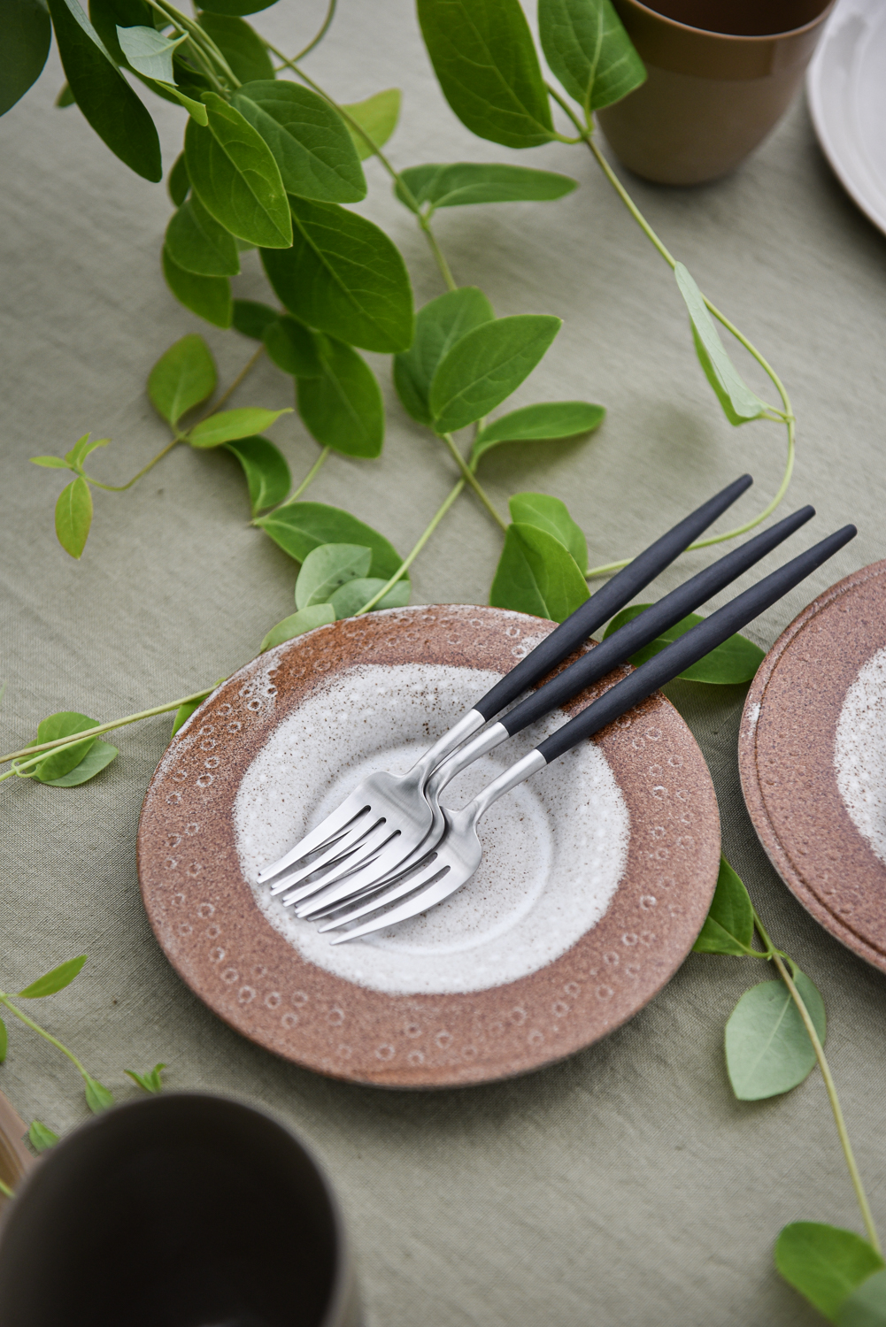 Lyse lintekstiler gir ro og eleganse. Fint med svake ruter og striper for at det ikke skal bli for stramt og høytidelig. Vi bruker neverkrull som serviettring for å få inn flere naturelementer. Bestikk fra serien Goa Ivory–stål passer perfekt til denne stemningen.