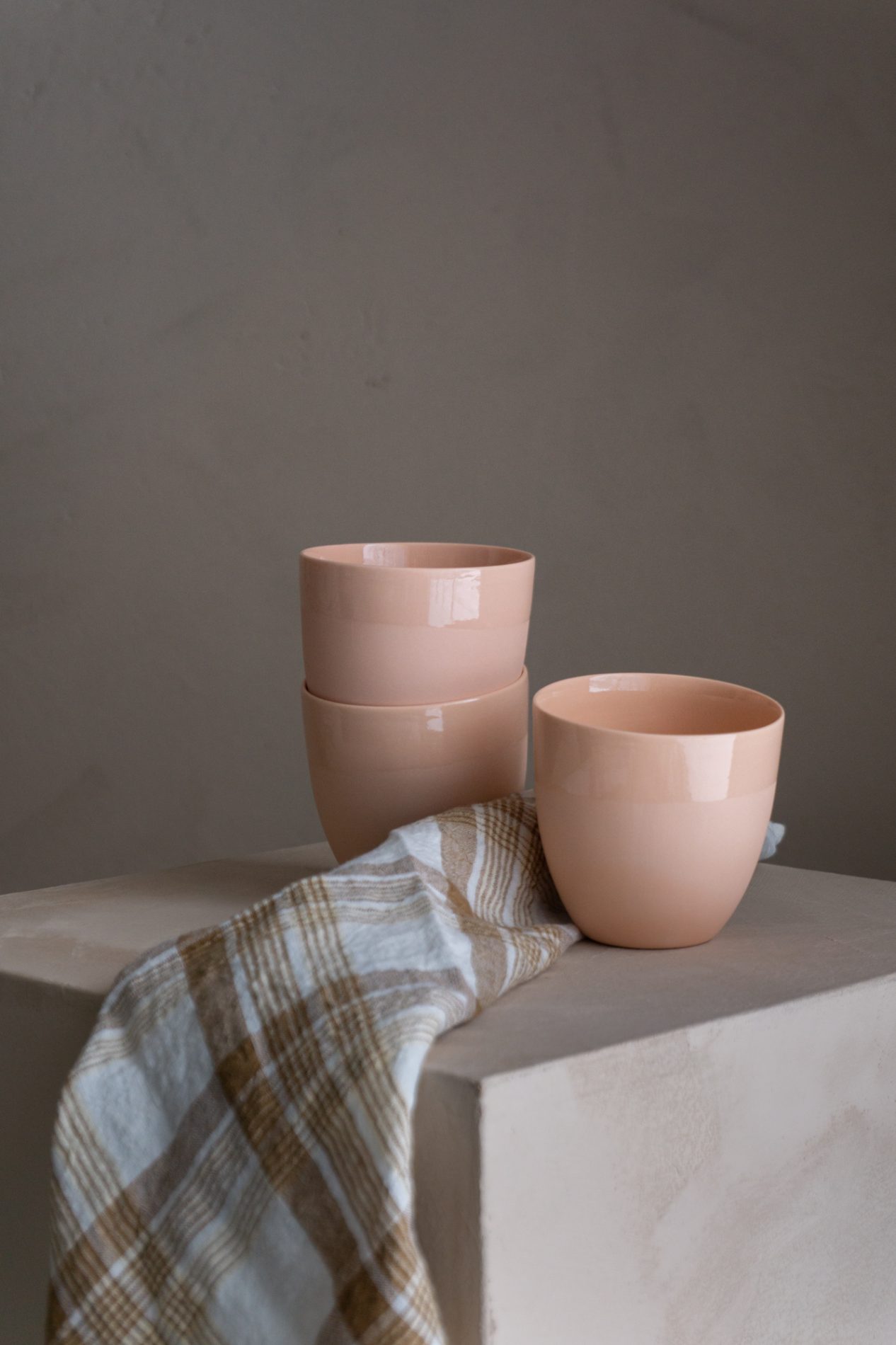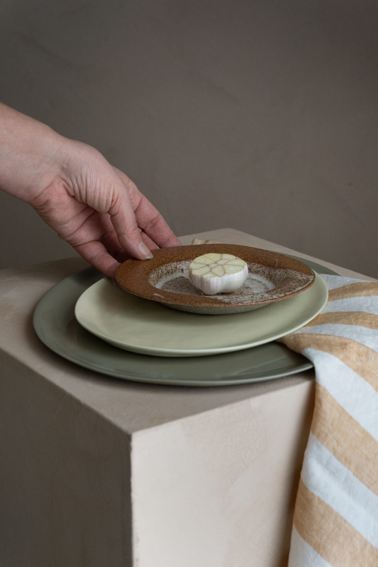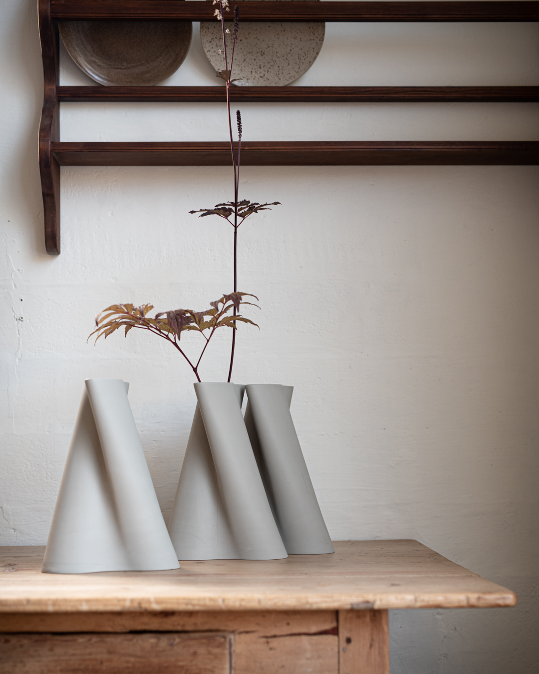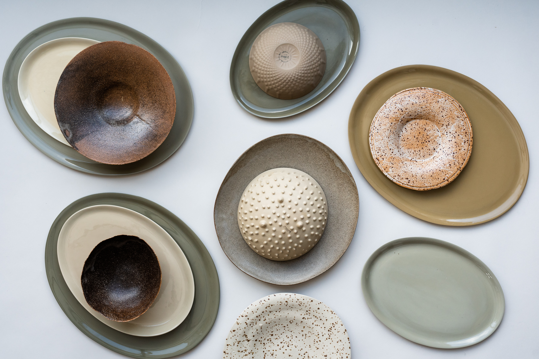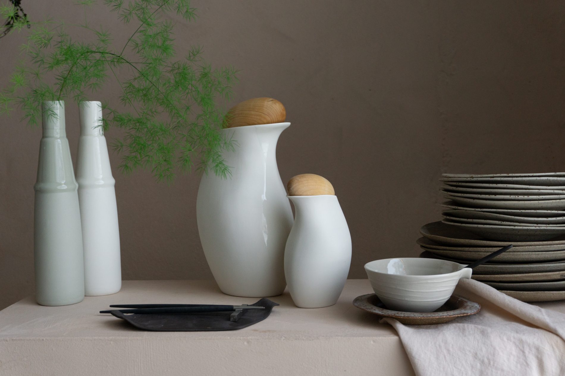 Våre håndlagde steingodsprodukter skaper en vakker kontrast til porselenet. Den rustikke, taktile overflaten gir dybde og varme, mens porselenets rene linjer og lysere uttrykk løfter helheten. Bare noen få elementer i leire mot porselen – eller omvendt – får alt til å virkelig poppe.