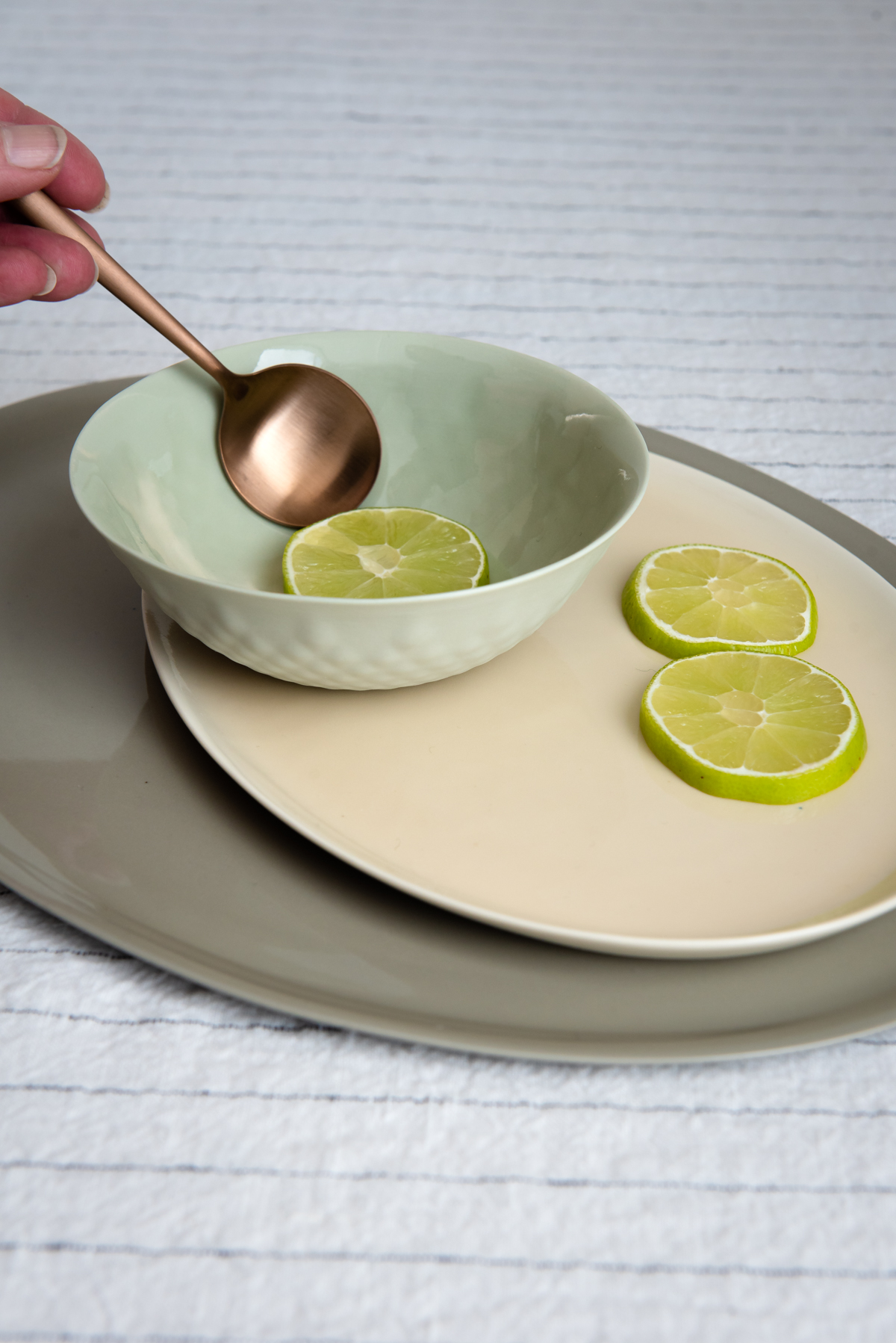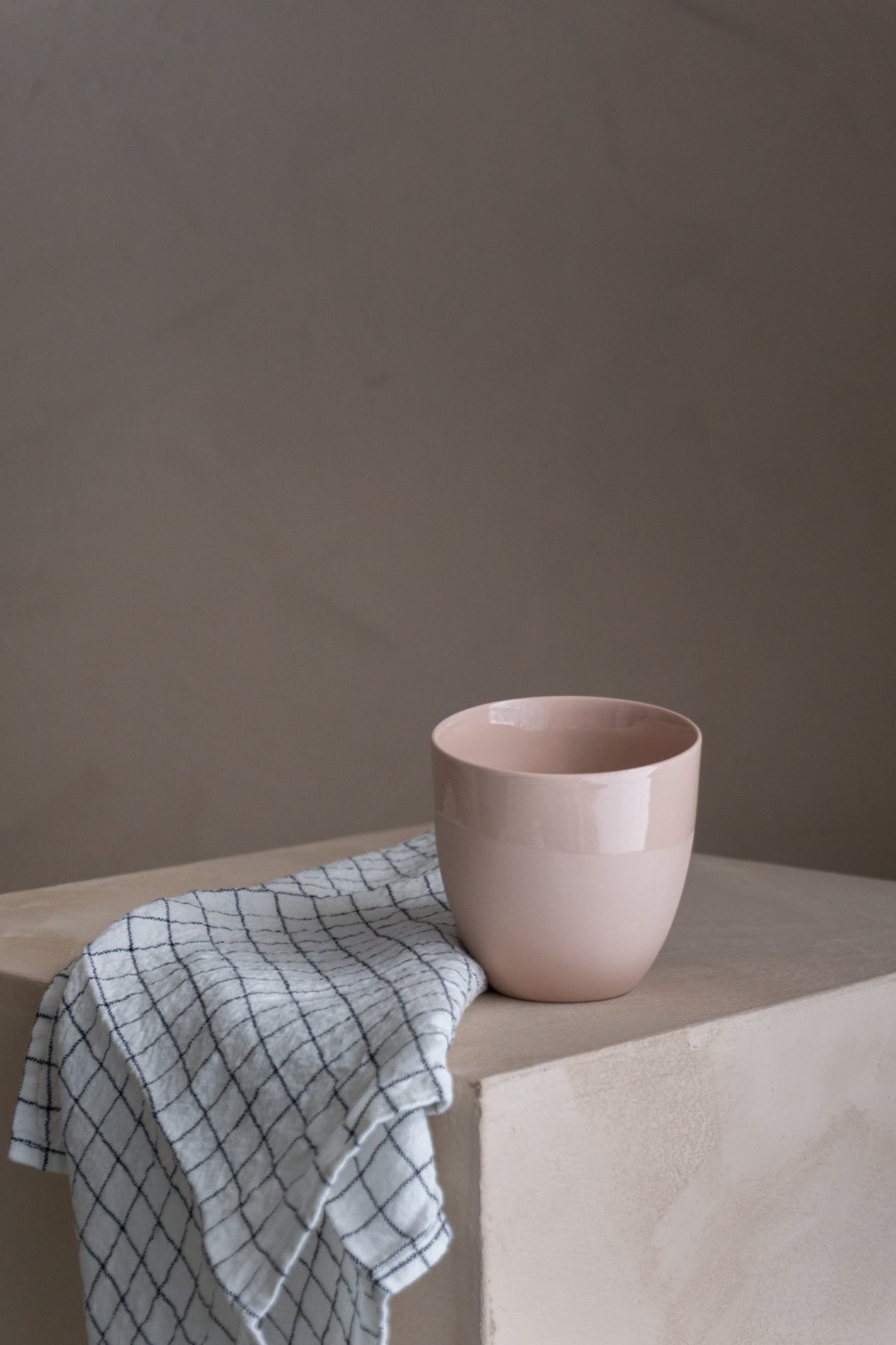 De naturlige nyansene i porselenet møter tekstur og dybde i farget lin – en kombinasjon i farge og materialer som frister til å leke med farger -og mønstermiks.