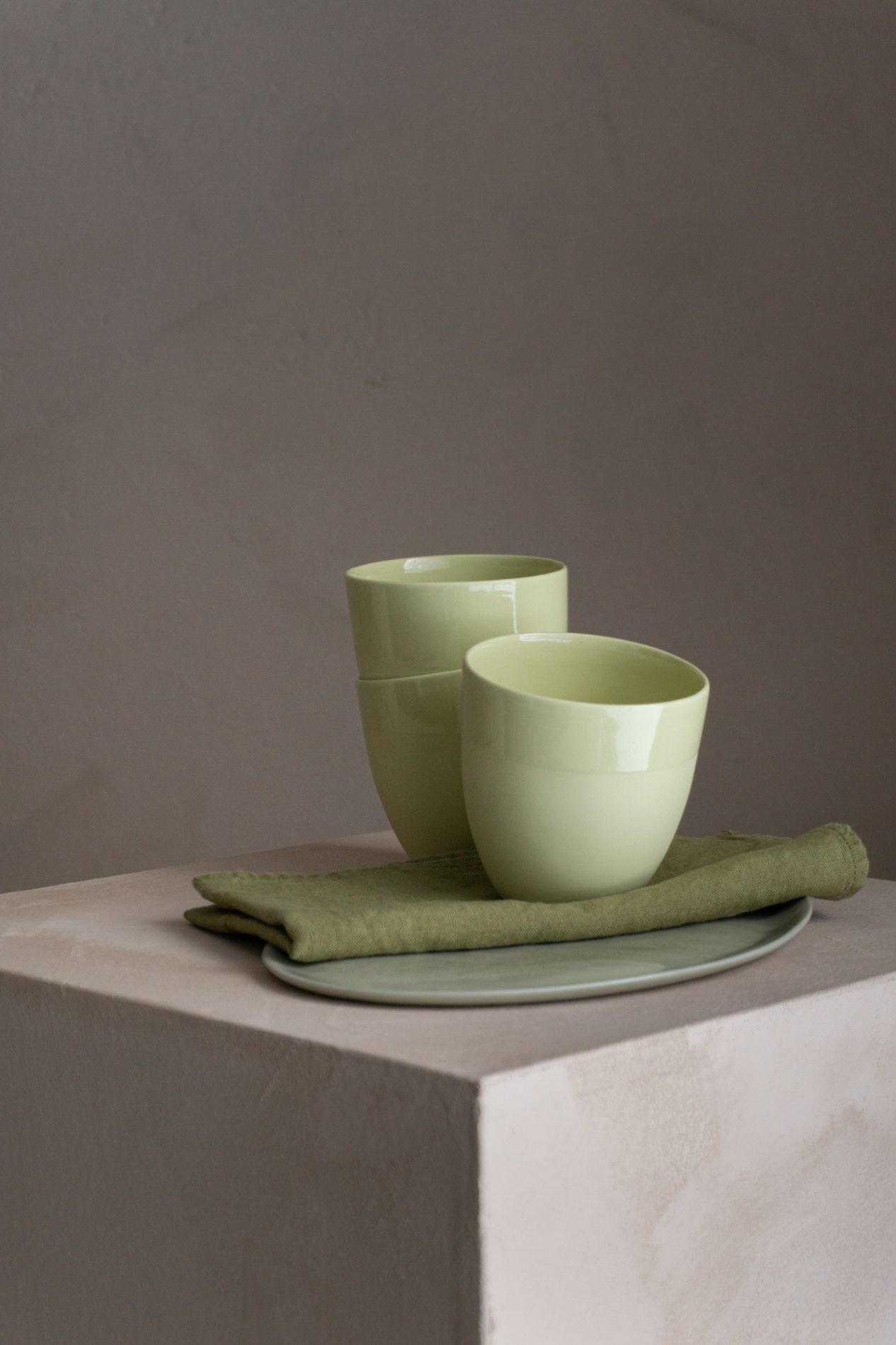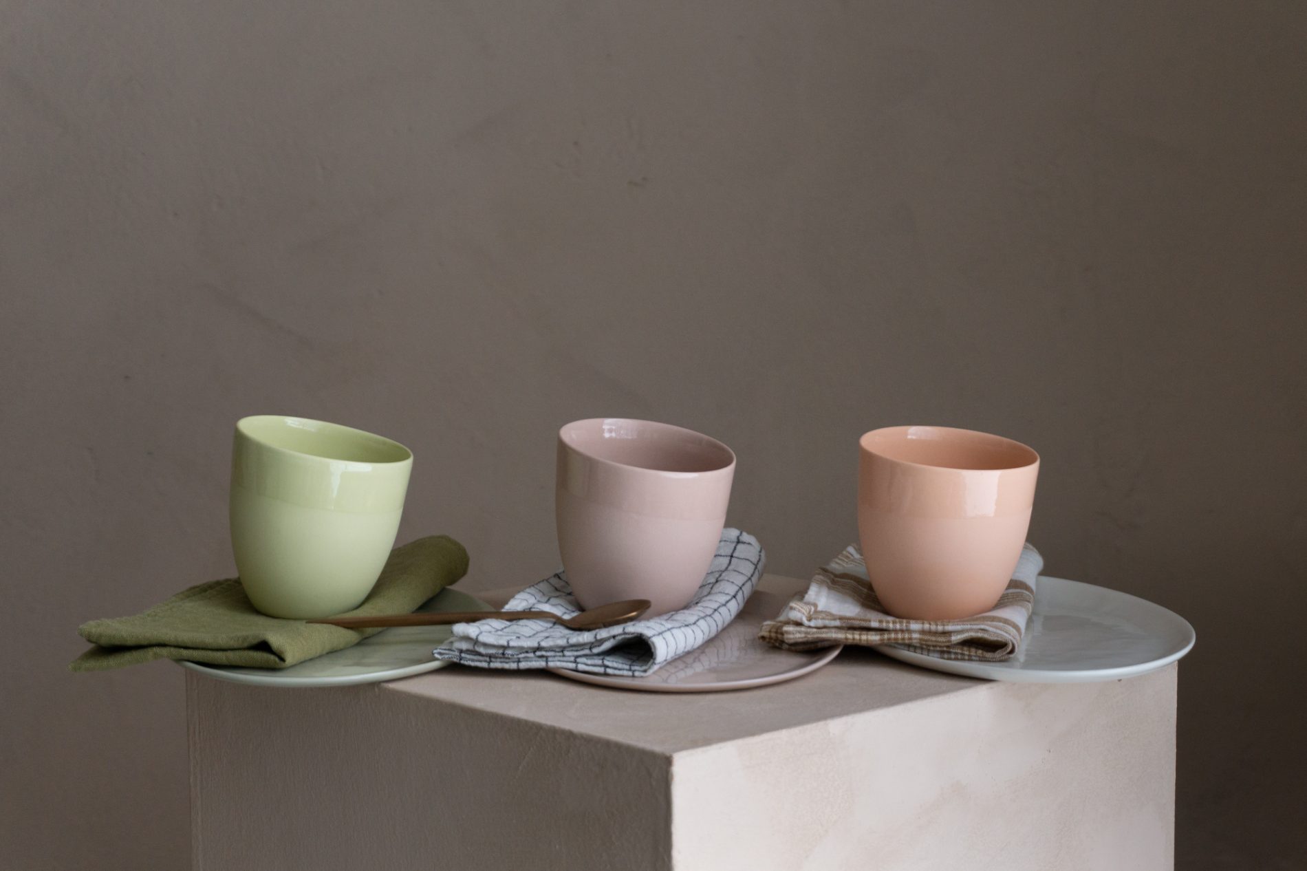 Våre gjennomfargede Krum kaffekopper og linservietter skaper en frisk og harmonisk helhet.